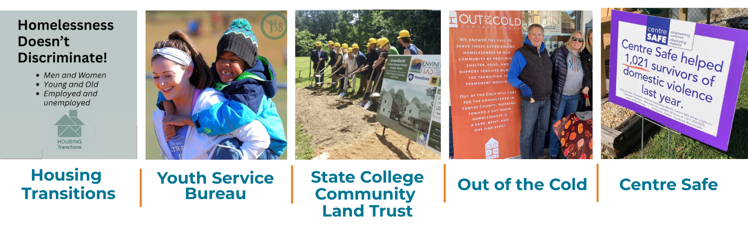 The organizations supported by Gimme Shelter include: Out of the Cold, Centre Safe, Housing Transitions, Centre County Youth Service Bureau, and State College Community Land Trust. Each plays a distinct role, from emergency shelter and transitional housing to youth services and long-term community stability, yet all benefit when residents work together to amplify impact across the sector.